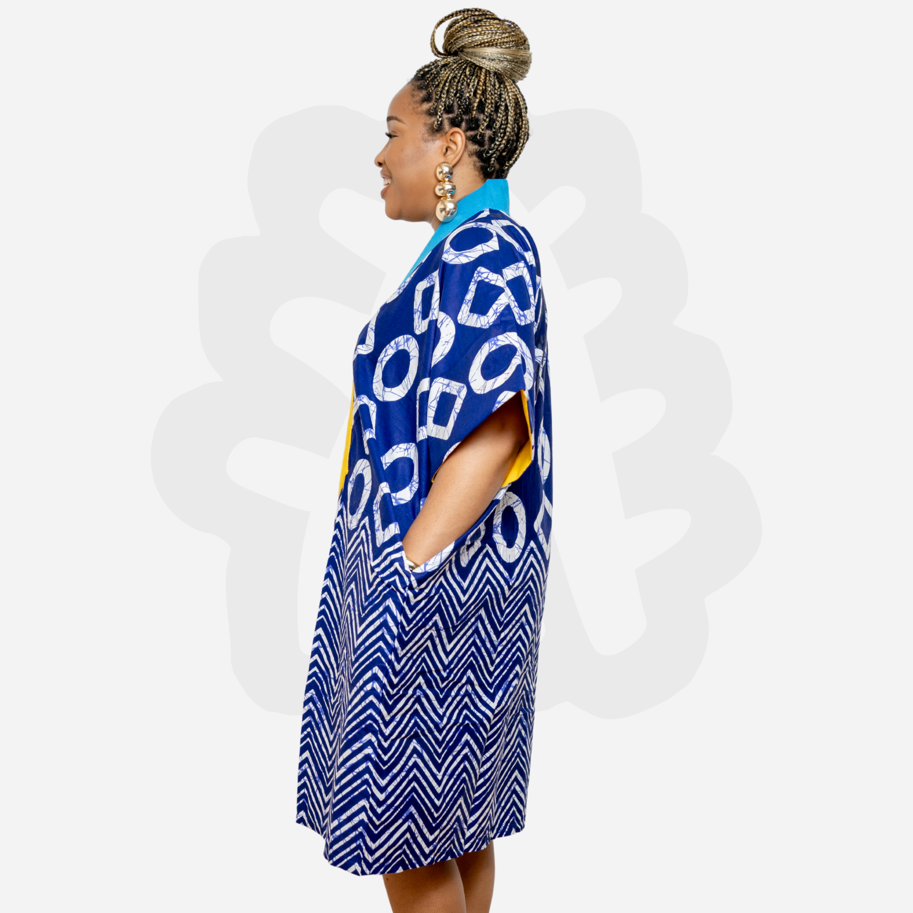 Turn heads with this vibrant Shorty Bubu. Designed to be both expressive and playful, this piece blends contemporary edge with deep-rooted Adire tradition. The hand-dyed batik center panel adds contrast and structure, giving this mini-length kaftan a standout silhouette.